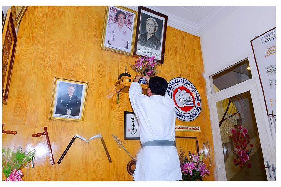 Sau khi ổn định vị trí, Võ sư Phan Gia Uẩn – Phó Chủ tịch Hội, dâng nén hương trên bàn thờ tổ, toàn thể môn sinh thực hiện nghi lễ chào tổ sư, cố chưởng môn, các vị tiền bối… Tiếp đó, các môn sinh hướng về màn hình máy tính chào Thầy Nguyễn Tấn Kiệt – Chủ tịch Hội Karatedo Khánh Hòa, vị ân sư khả kính của rất nhiều thế hệ học trò Karatedo Khánh Hòa. Thật là hoan hỉ, khi trong giờ phút này – qua trực tuyến – dù rất nhiều công việc bận rộn nơi xứ người, Thầy vẫn dành thời gian dự Lễ Bái tổ với các học trò của mình. Trong không khí trang nghiêm, an lành của buổi sáng đầu xuân, của hương trầm thoang thoảng, lắng nghe lời chúc Tết của Thầy, lời nhắn nhủ của Thầy về việc tu thân, hành nghiệp trong lòng các Karateka Khánh Hòa, ai cũng đều dâng tràn cảm xúc khó tả, tự nhủ sẽ cùng Thầy đi hết con đường của sự nghiệp Karatedo Khánh Hòa. Môn sinh Lê Văn Hồng - một trong những học trò đầu tiên được Thầy truyền dạy Karatedo tại trường Nguyễn Văn Trỗi, Nha Trang – thay mặt đại chúng chúc Tết Thầy và gia quyến.