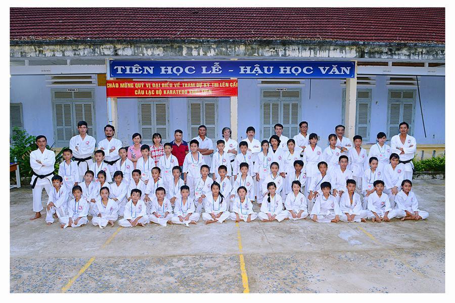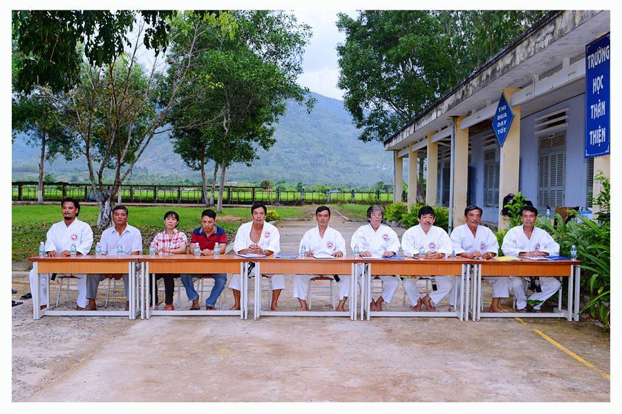 Về tham dự kỳ thi ngoài các giám khảo do Hội phân công còn có sự hiện diện của bà Nguyễn Thị Thanh Huệ - Hiệu trưởng, bà Lê Vũ Anh Thư – Chủ tịch Công đoàn nhà trường và các phụ huynh võ sinh. Các võ sinh thi lên đai trắng 1 vạch xanh đã thực hiện đầy đủ 3 nội dung: Kata (Bài Heian Shodan), Kihon và thể lực.