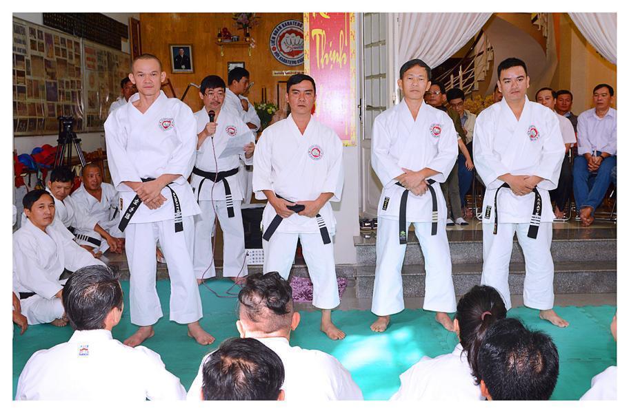 Võ sư Phạm Ngọc Thương – Ủy viên BCH Hội đọc quyết định của Chủ tịch Hội về việc thành lập Ban Chuyên môn và Huấn luyện của Hội, Võ sư Phan Gia Uẩn được phân công làm nhiệm vụ Trưởng Ban, đồng thời buổi ra mắt của Ban này được tiến hành. Nhân dịp này, ba Ban huấn luyện của ba lớp Huyền đai sau thời gian kiện toàn cũng được giới thiệu trước đại chúng. Chương trình buổi lễ tiếp tục bằng Lễ Thắt đai đen và nhập môn cho 7 môn sinh Huyền đai, phong đẳng cho 3 môn sinh lên Huyền đai đệ nhị đẳng, 2 môn sinh lên Huyền đai đệ tam đẳng (trong kỳ thi lên đẳng Karatedo tỉnh Khánh Hòa đợt 2 năm 2016, được biết, đợt chính thức đã có 28 môn sinh ở các cấp đẳng này được chấm đậu).