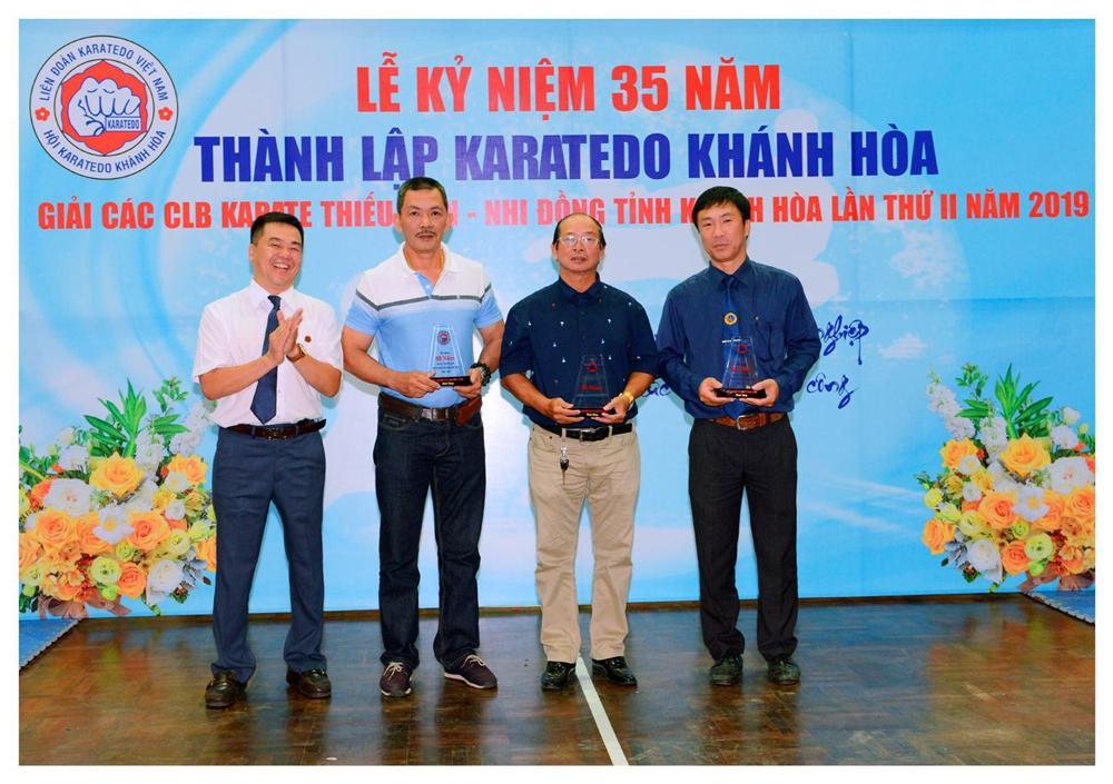 Hai Ông Phan Gia Uẩn và Nguyễn Phúc Vinh – Phó Chủ tịch Hội lần lượt trao biểu trưng 35 năm Karatedo Khánh Hòa đến quý đại biểu, các nhà tài trợ, các vị thân hữu, đại diện các môn sinh khóa đầu của Karatedo Khánh Hòa.