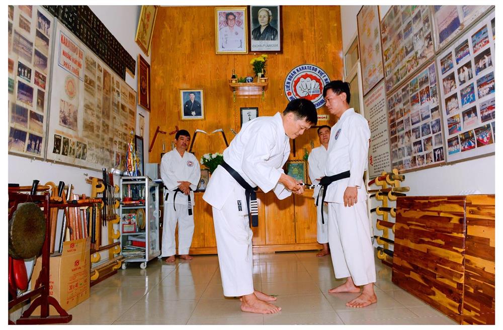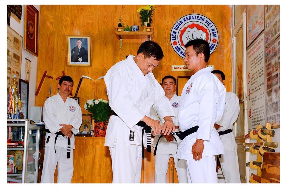 Võ sư Nguyễn Văn Minh mang đẳng cho môn sinh Mai Văn Bằng