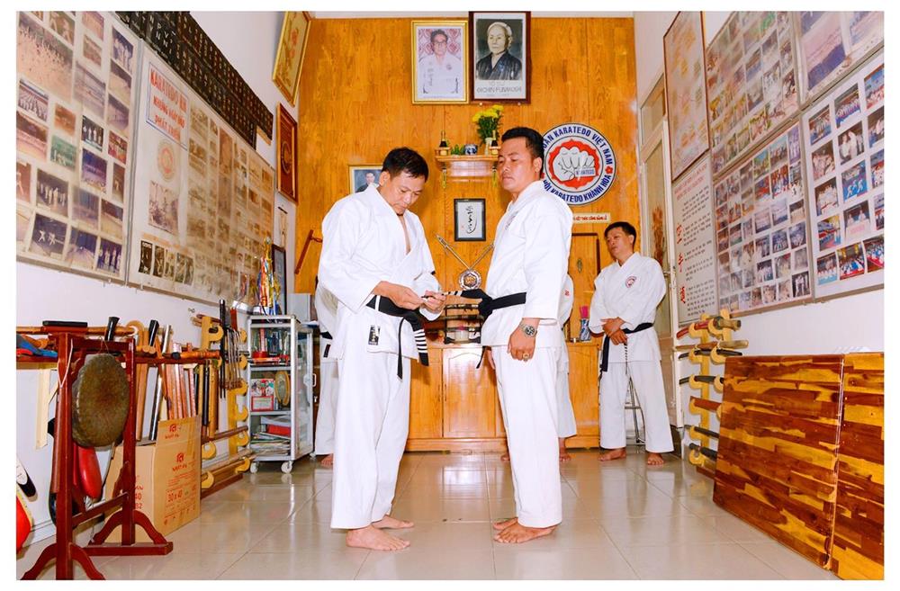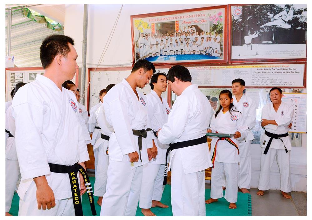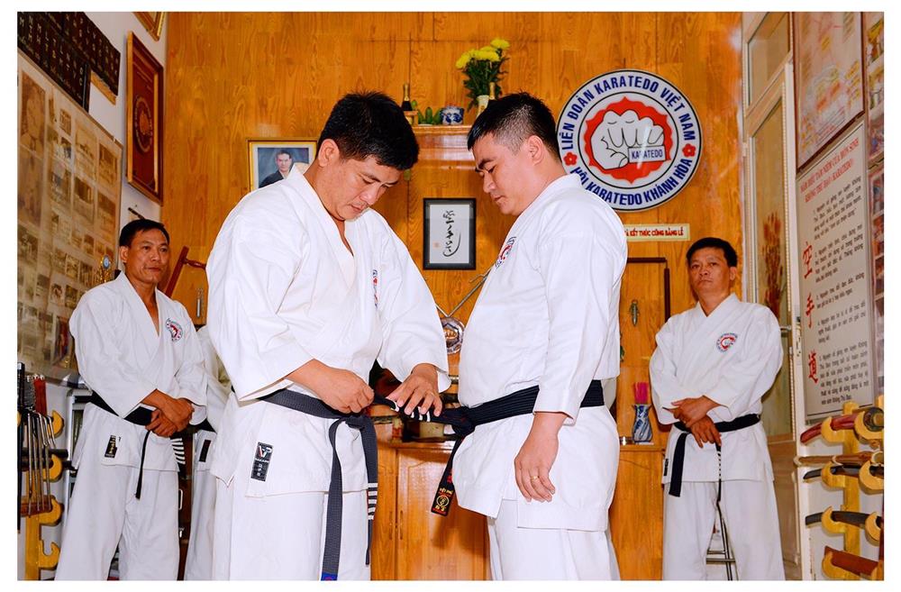 Võ sư Văn Đình Thanh,Tổng Thư ký Hội Karatedo tỉnh Khánh Hoà mang đẳng cho môn sinh Lương Minh Nhân
