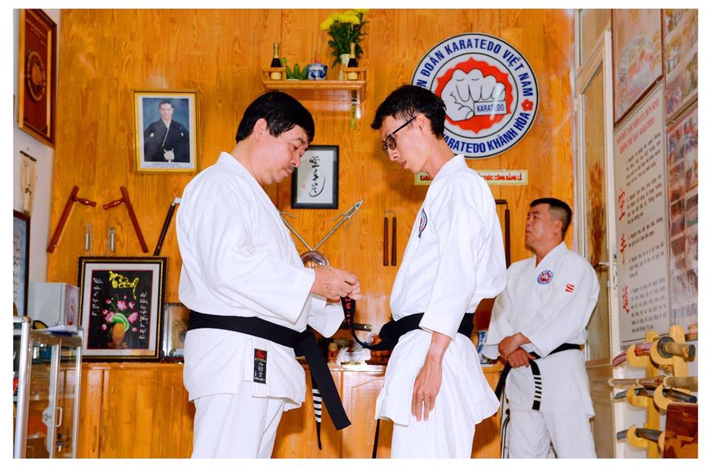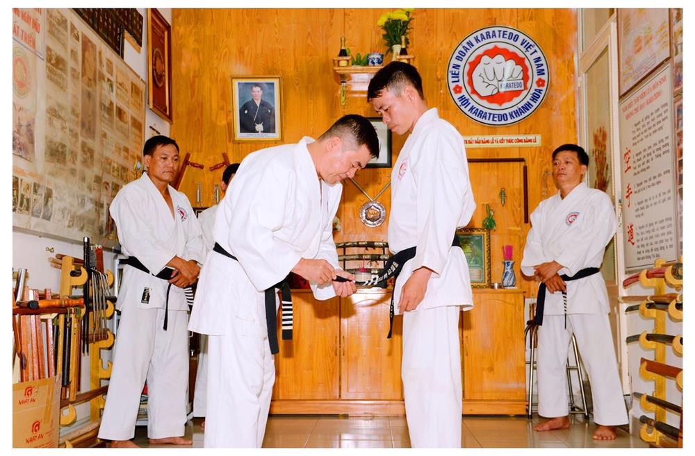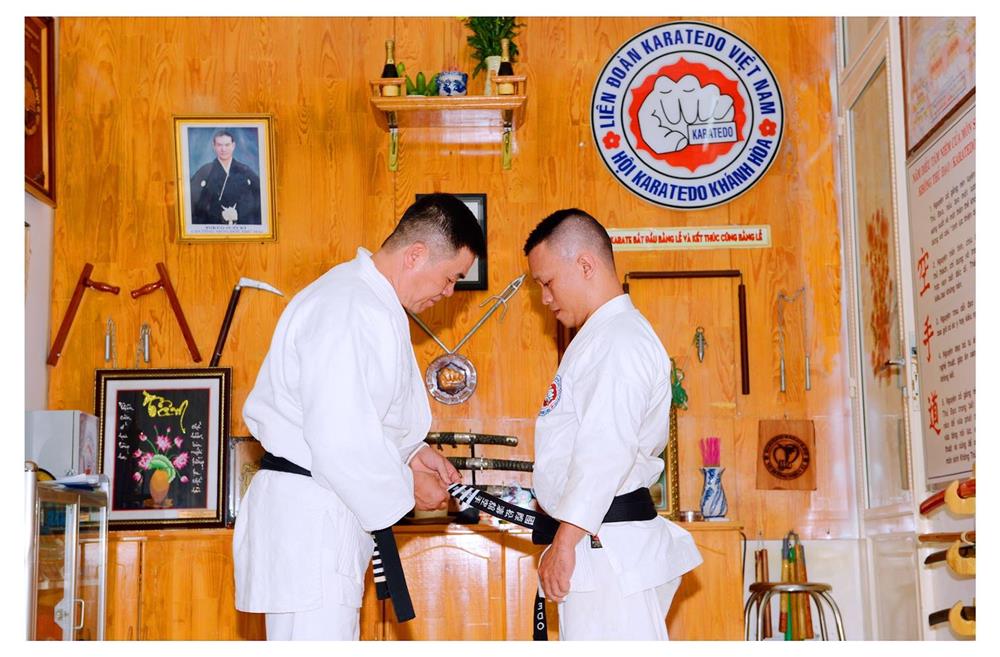 Võ sư Nguyễn Văn Minh,Phó Chủ tịch Hội Karatedo tỉnh Khánh Hoà mang đẳng cho môn sinh Trần Đình Tưởng