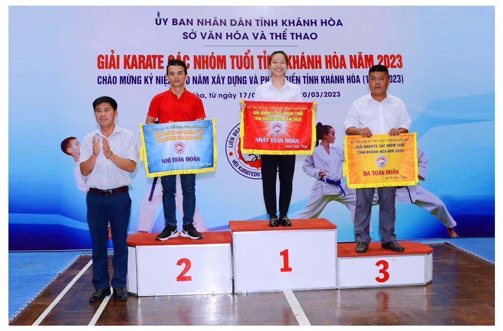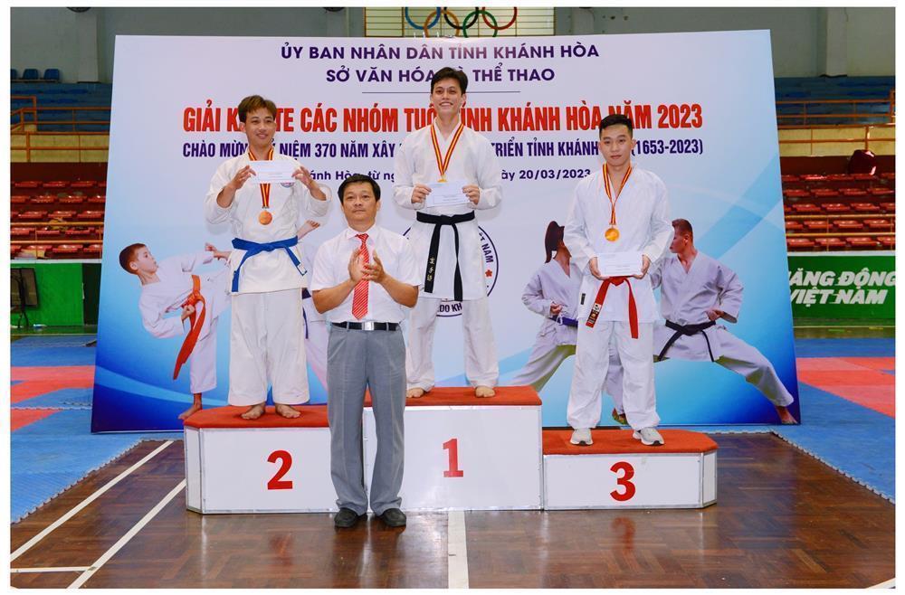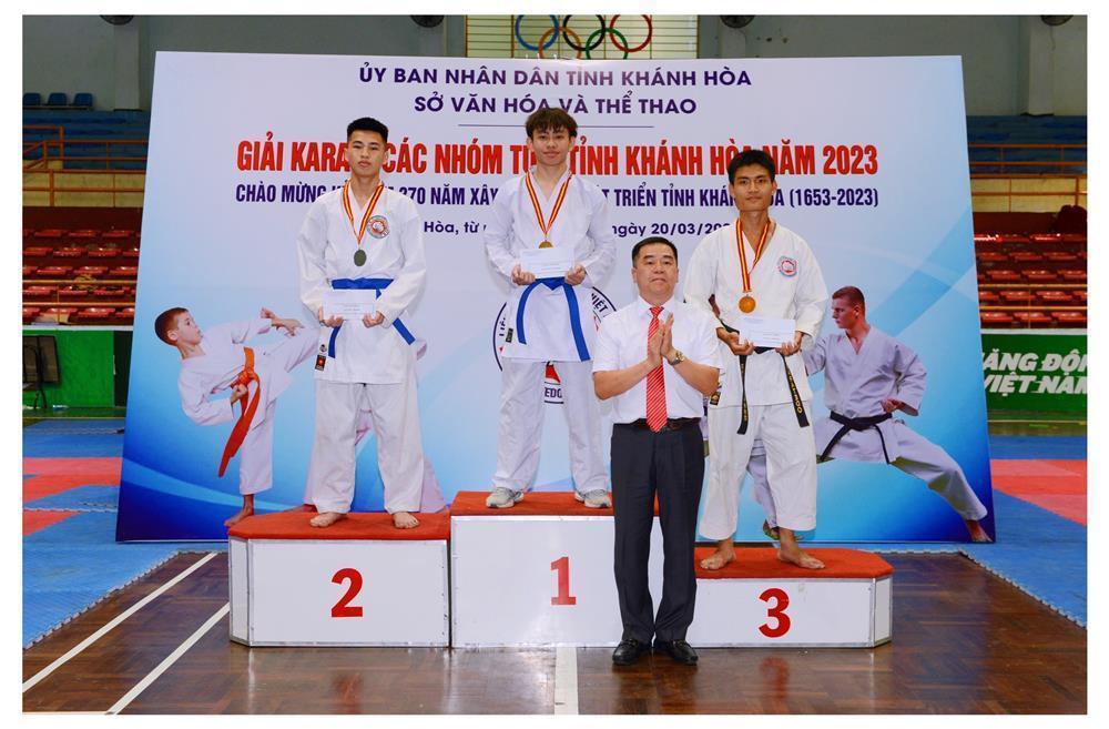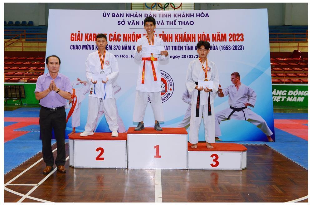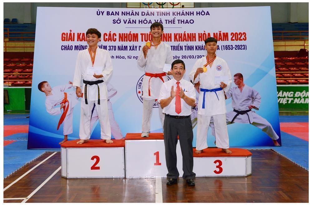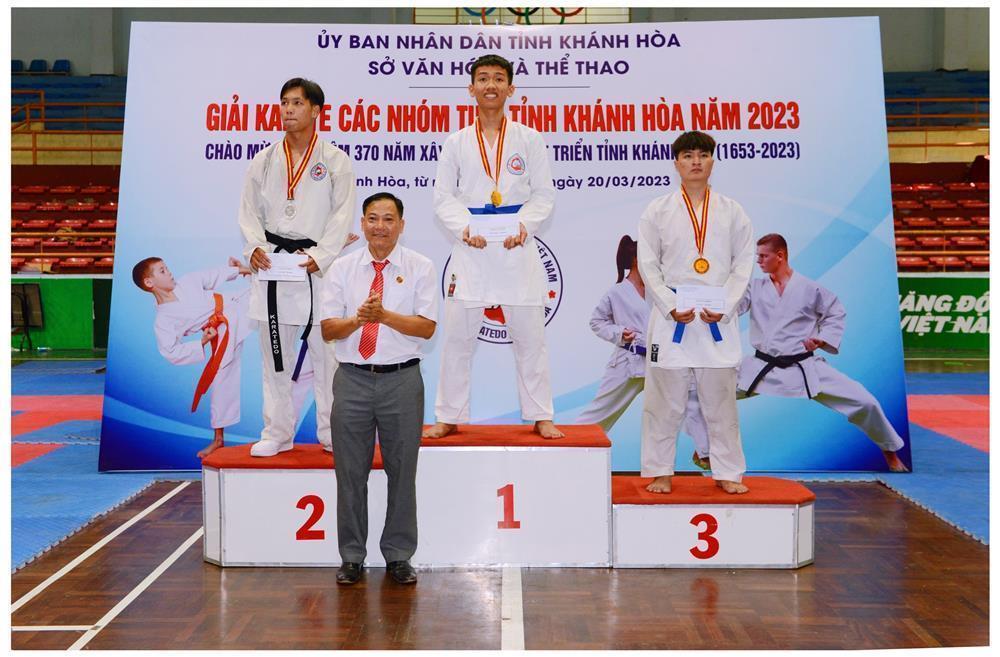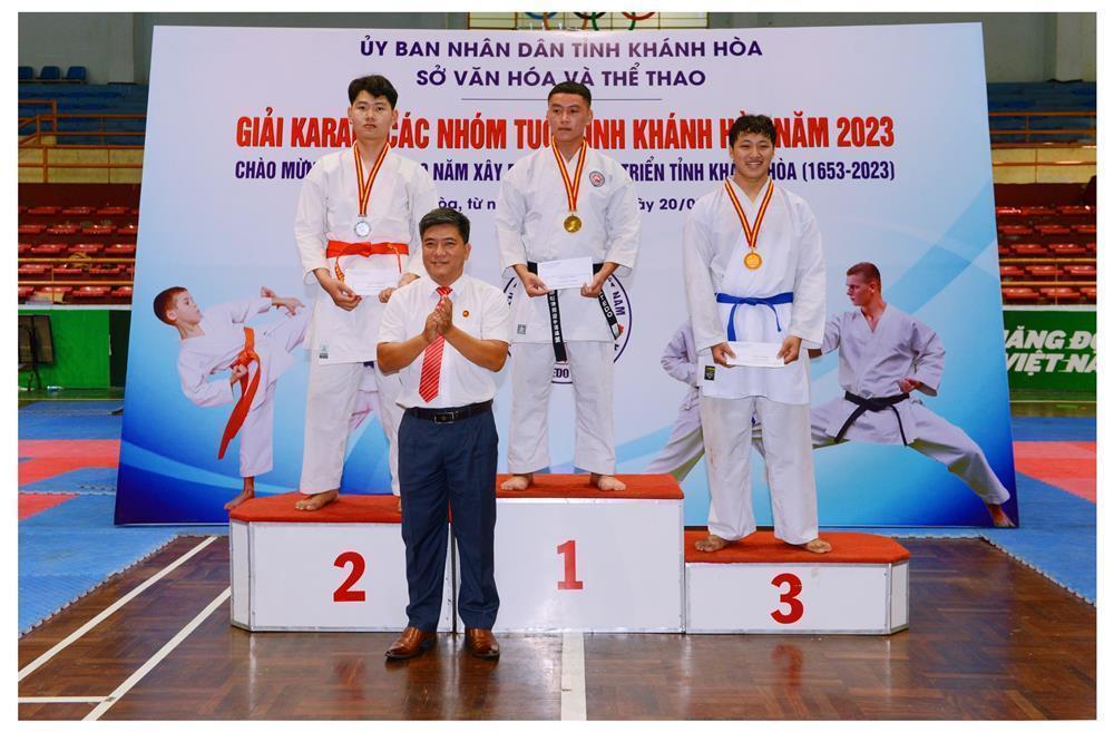 Ông Phan Gia Uẩn, Chủ tịch Hội Karatedo tỉnh Khánh Hoà trao huy chương và phần thưởng